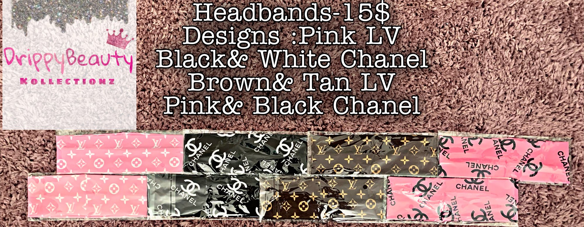 Spandex material inspired headbands. Available in 4 designs; Pink LV Black Chanel Brown LV Pink Chanel